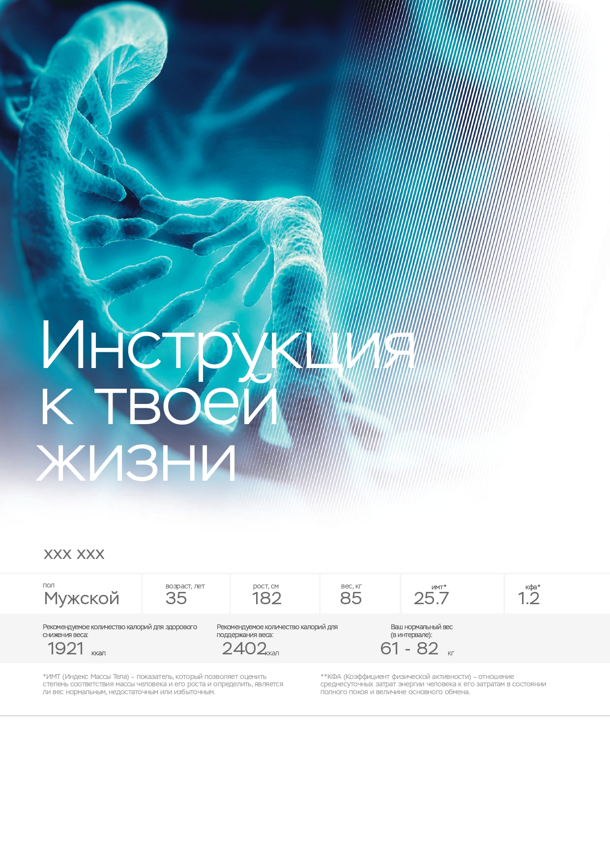 | Рацион питания Метаболизм алкоголя Метаболизм кофеина Физическая нагрузка Непереносимости Вкусовые ощущения Никотин Психологические зависимости Пищевое поведение Потребность в витаминах Уровень холестерина Спортивный потенциал | Рацион питания Метаболизм алкоголя Метаболизм кофеина Физическая нагрузка Непереносимости Вкусовые ощущения Никотин Психологические зависимости Пищевое поведение Потребность в витаминах Уровень холестерина Спортивный потенциал | Рацион питания Метаболизм алкоголя Метаболизм кофеина Физическая нагрузка Непереносимости Вкусовые ощущения Никотин Психологические зависимости Пищевое поведение Потребность в витаминах Уровень холестерина Спортивный потенциал |